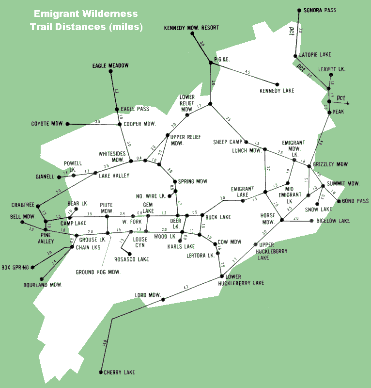 Hiking trail distances in the Emigrant Wilderness